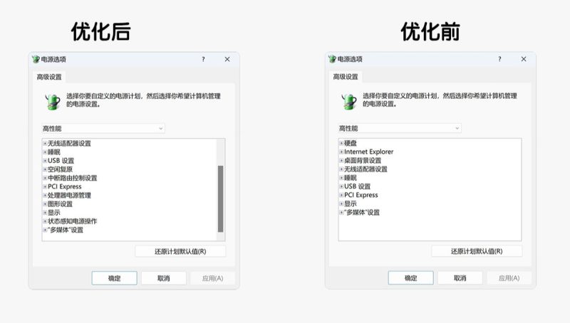 #更改高级电源设置 找回隐藏的 空闲复原、英特尔(R)显卡设置、中断路由控制设置、处理器电源管理、图形设置、状态感知电源操作 6项设置选项【查看对比效果图】