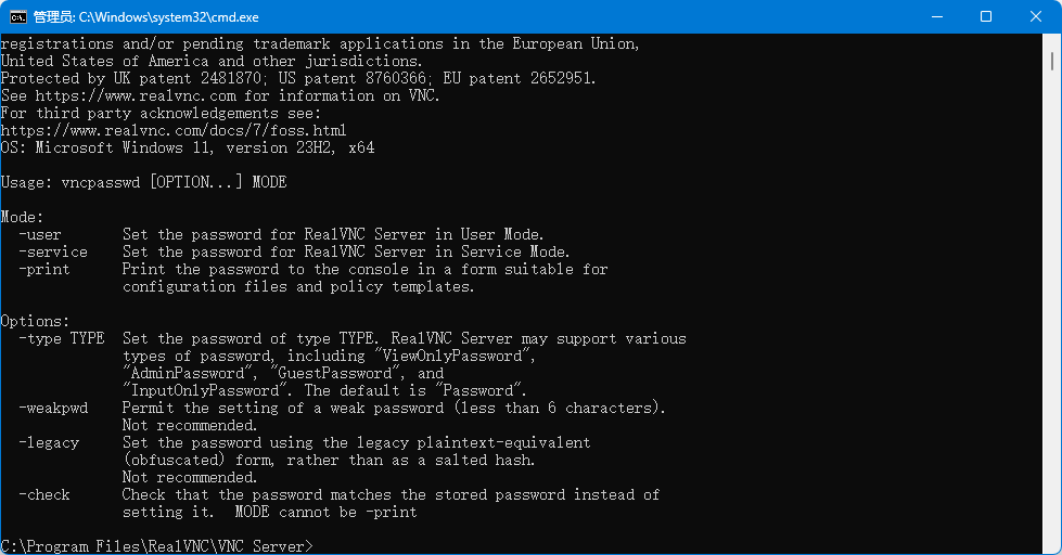 使用 RealVNC 服务器选项 UI 设置 VNC 密码时,启用加密后,密码将存储为加盐哈希值。如果禁用加密,或将其设置为 PreferOn 或 PreferOff,则如果要允许来自旧版 VNC 查看器的连接,则会显示“旧版”复选框。请注意,当启用“旧版”选项时,RealVNC Server 将仅使用密码的前 8 个字符。除非您有特定要求,否则不建议使用 “Legacy” 选项。